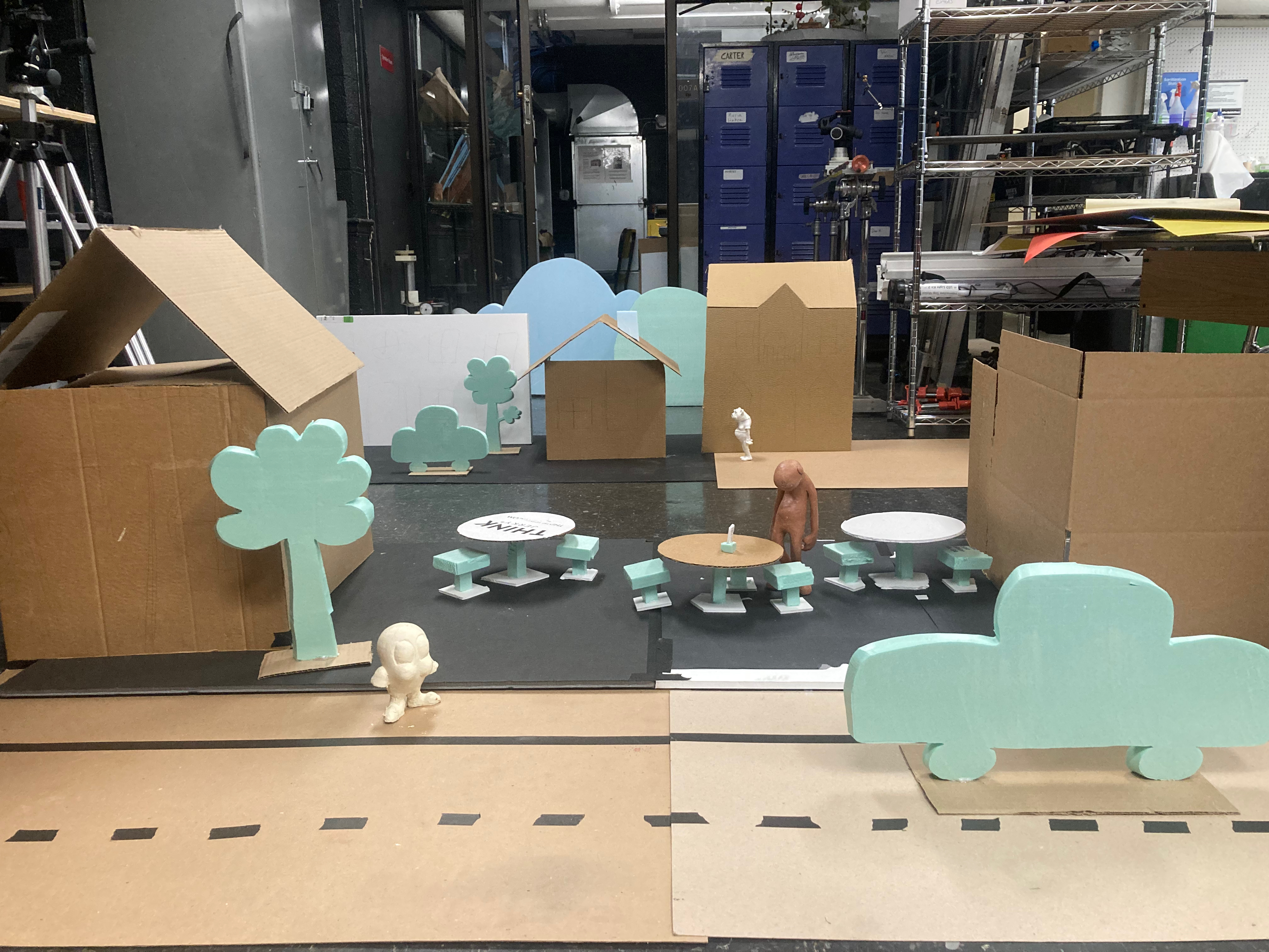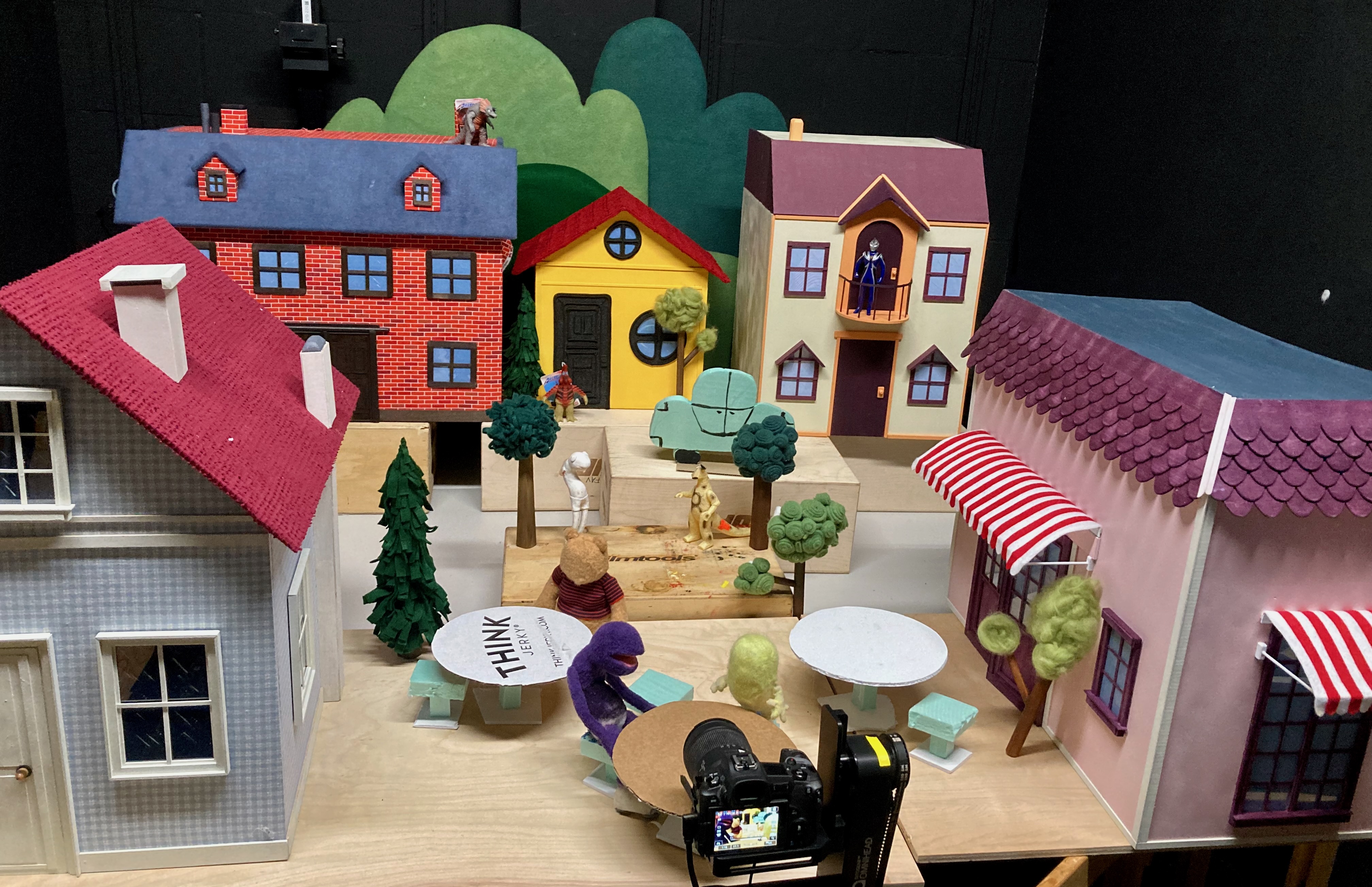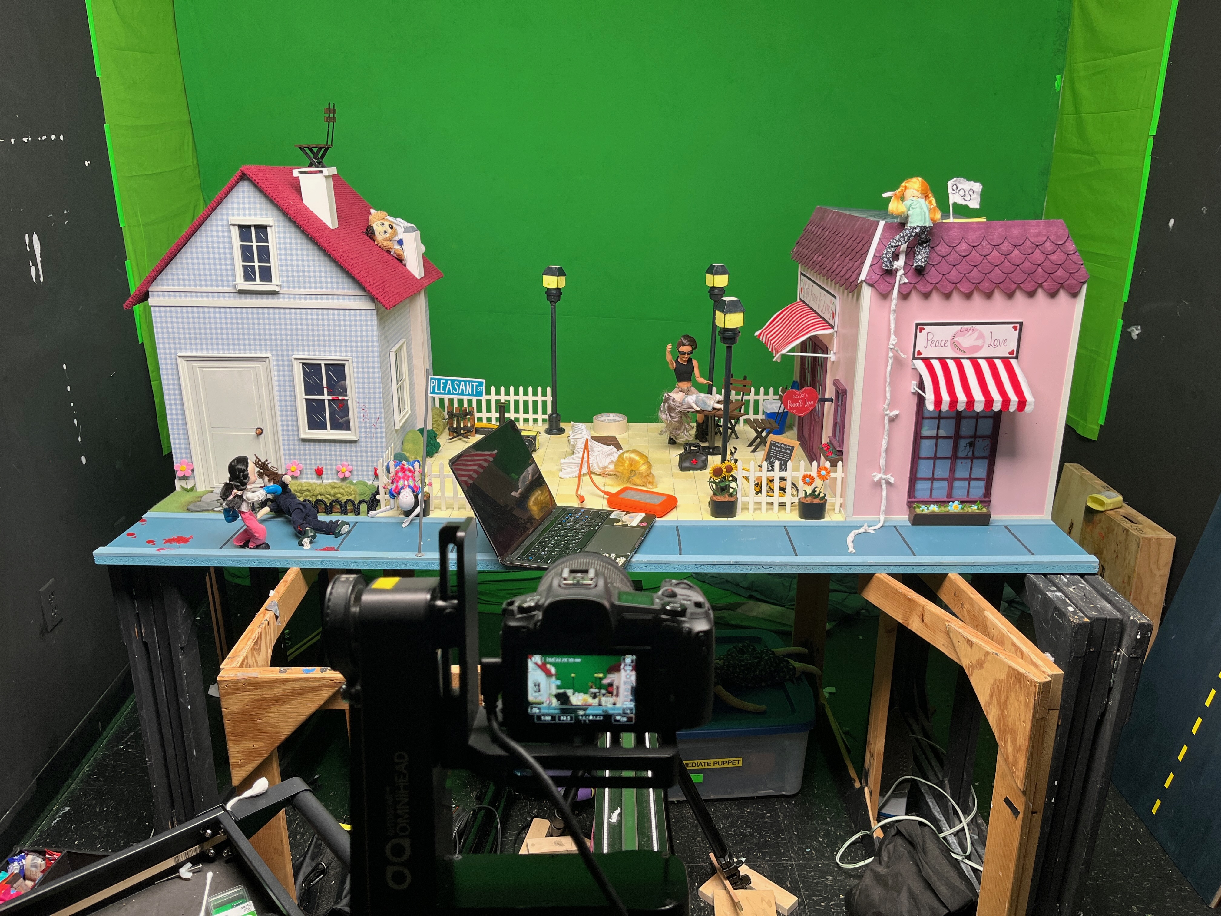 There were 5 set pieces all together. Each was treated as an independent set, being animated separately in front of a green screen. In post production I composited each panel together to create one large image of a perfect little town. To ensure that the camera movements (the big zoom out) stayed the same throughout each pass, I used a motion control camera that I programed within Dragonframe.