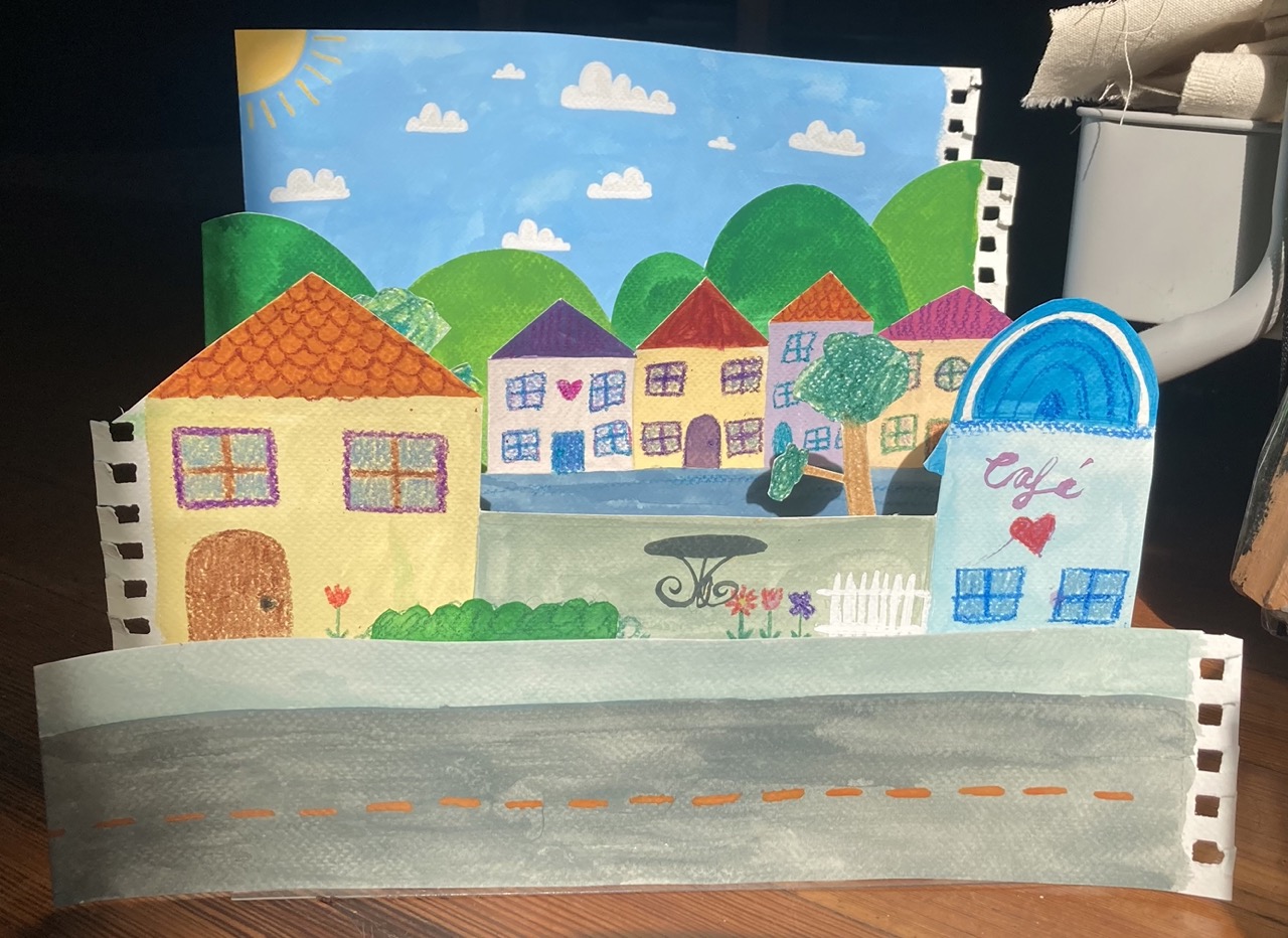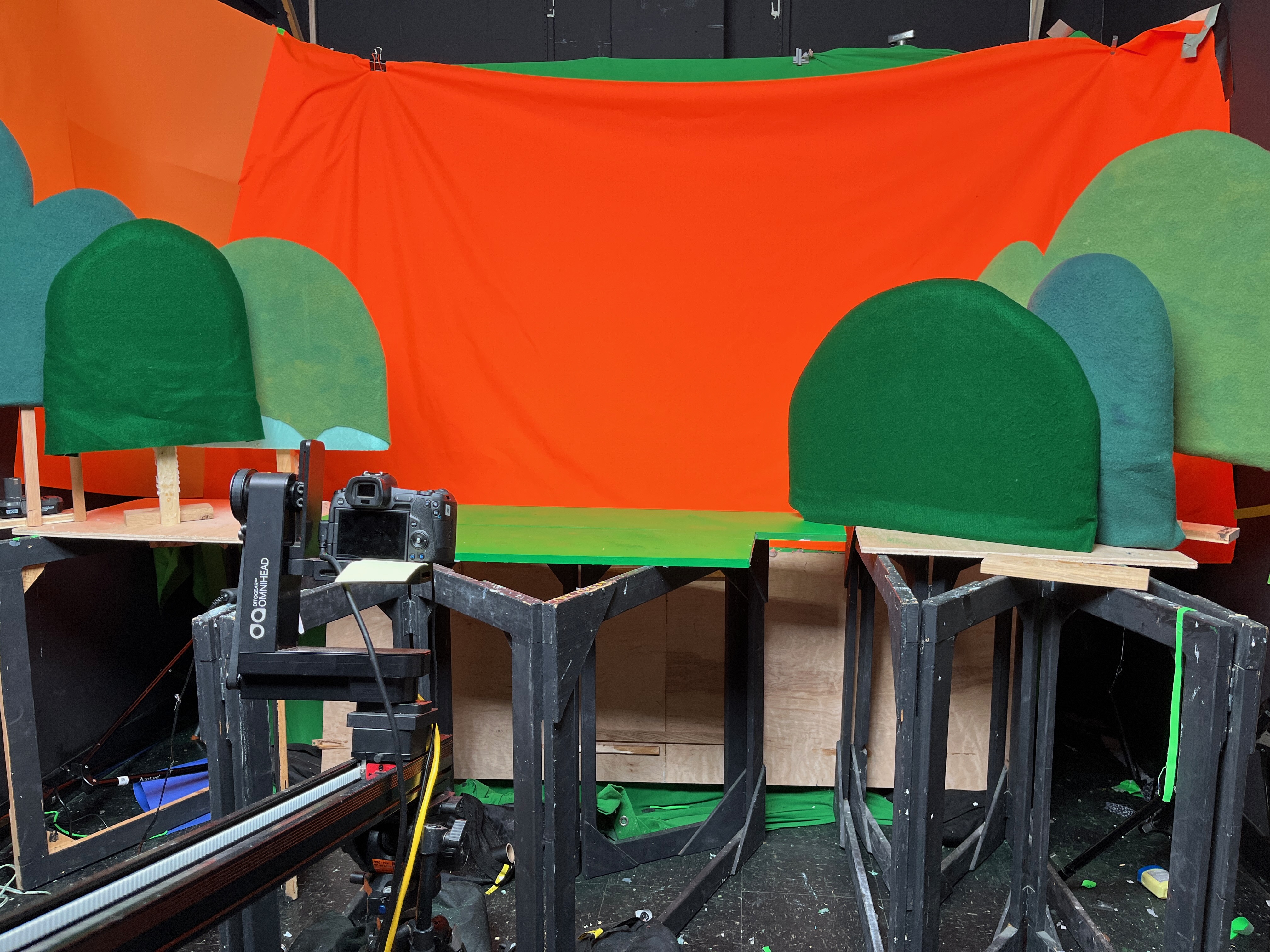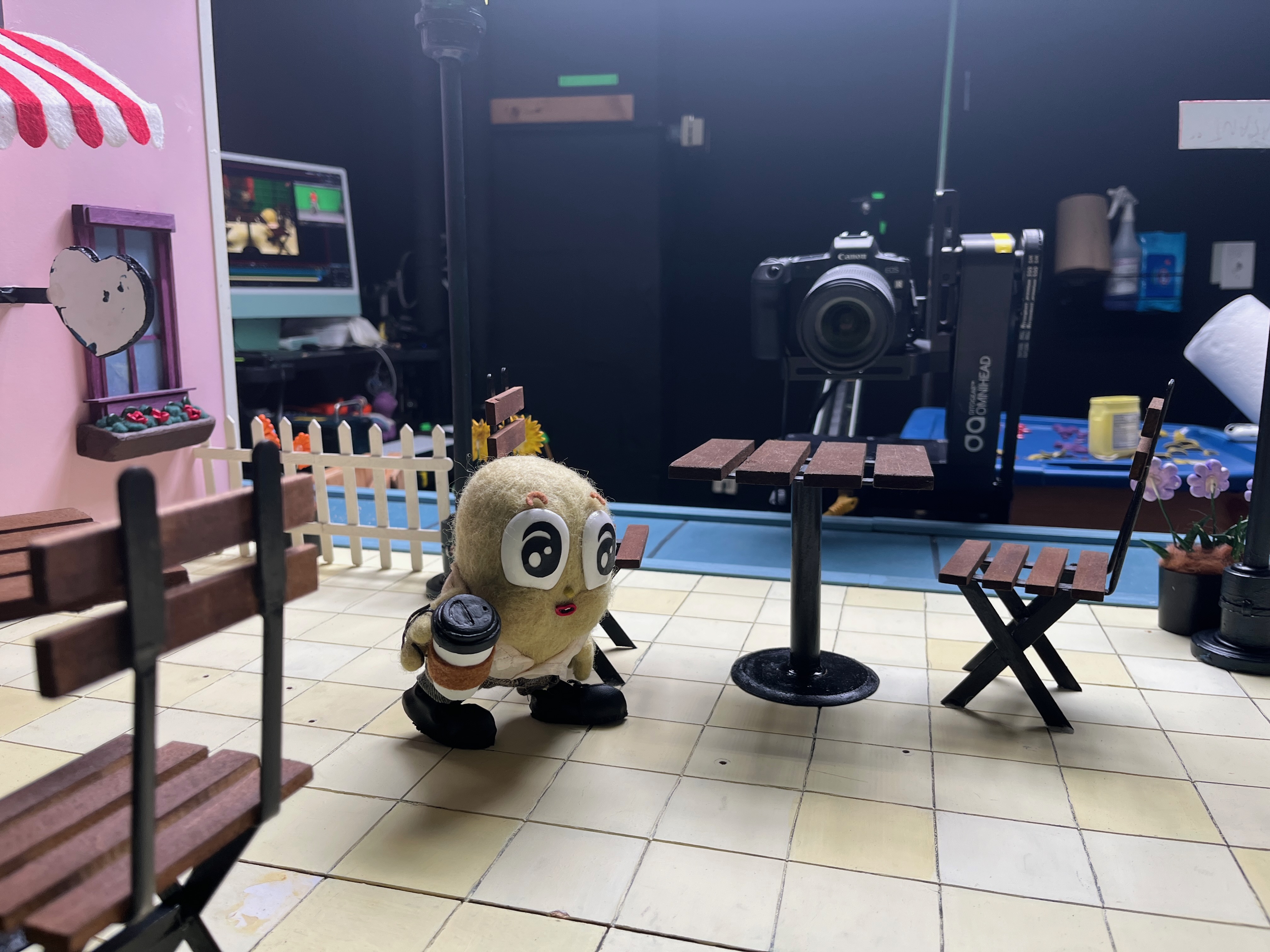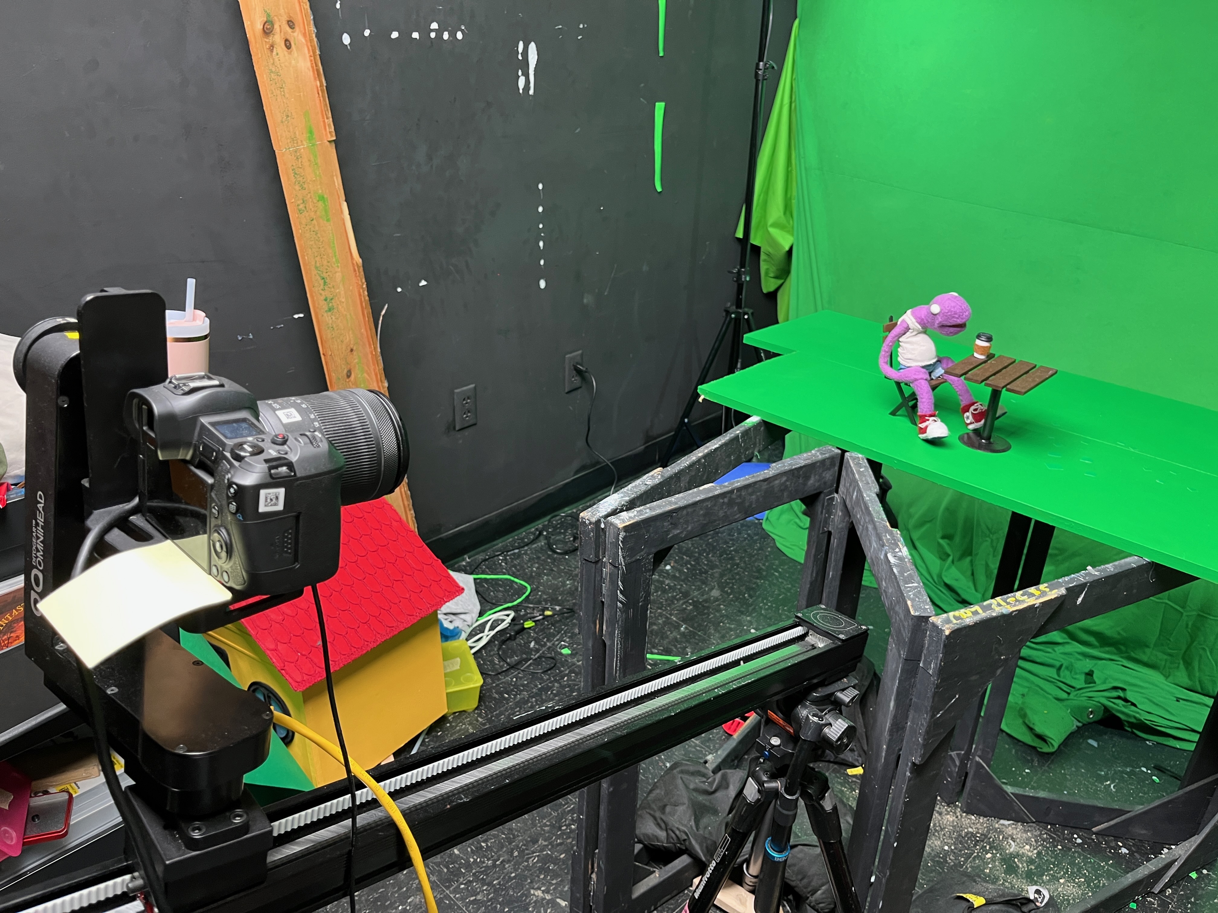 There were 5 set pieces all together. Each was treated as an independent set, being animated separately in front of a green screen. In post production I composited each panel together to create one large image of a perfect little town. To ensure that the camera movements (the big zoom out) stayed the same throughout each pass, I used a motion control camera that I programed within Dragonframe.