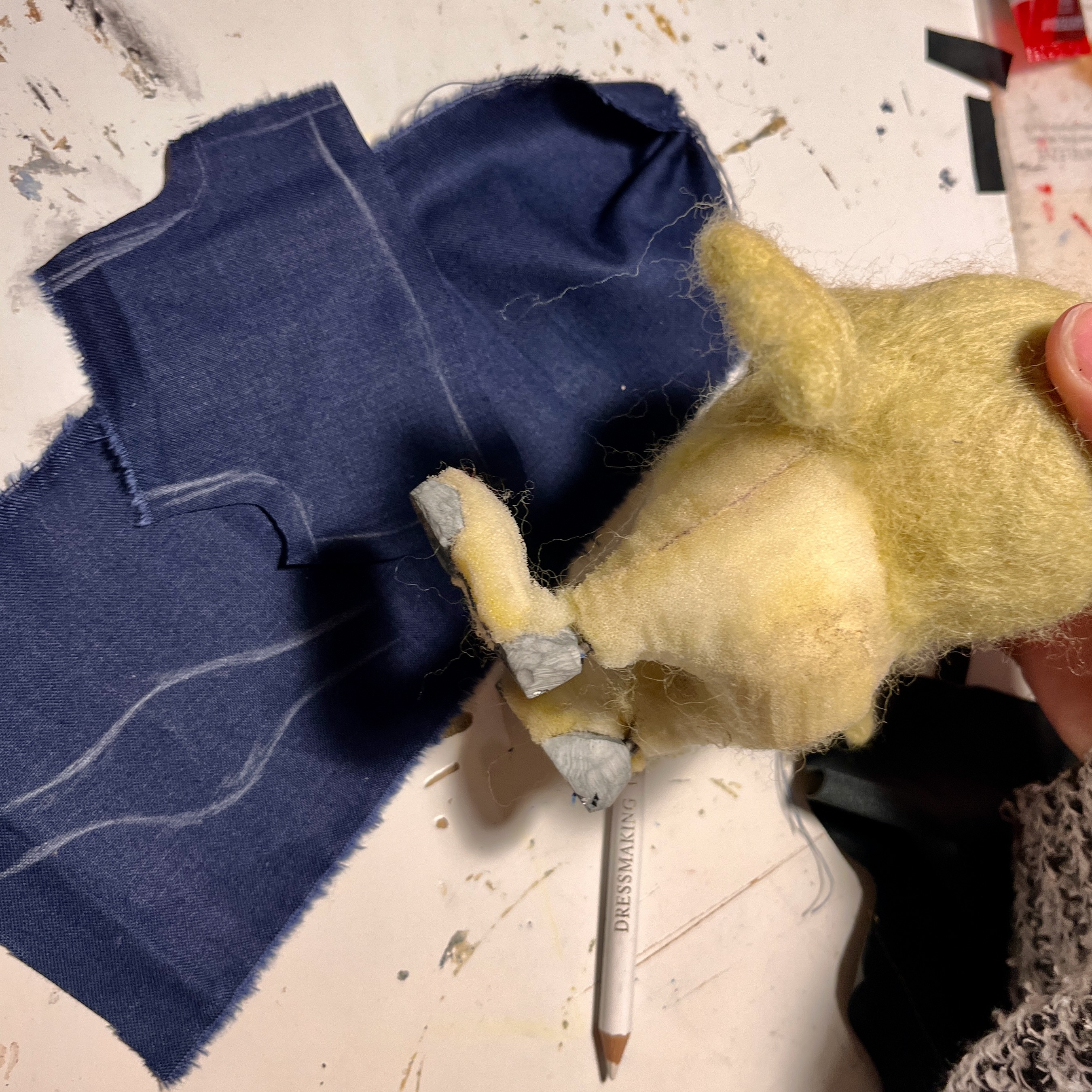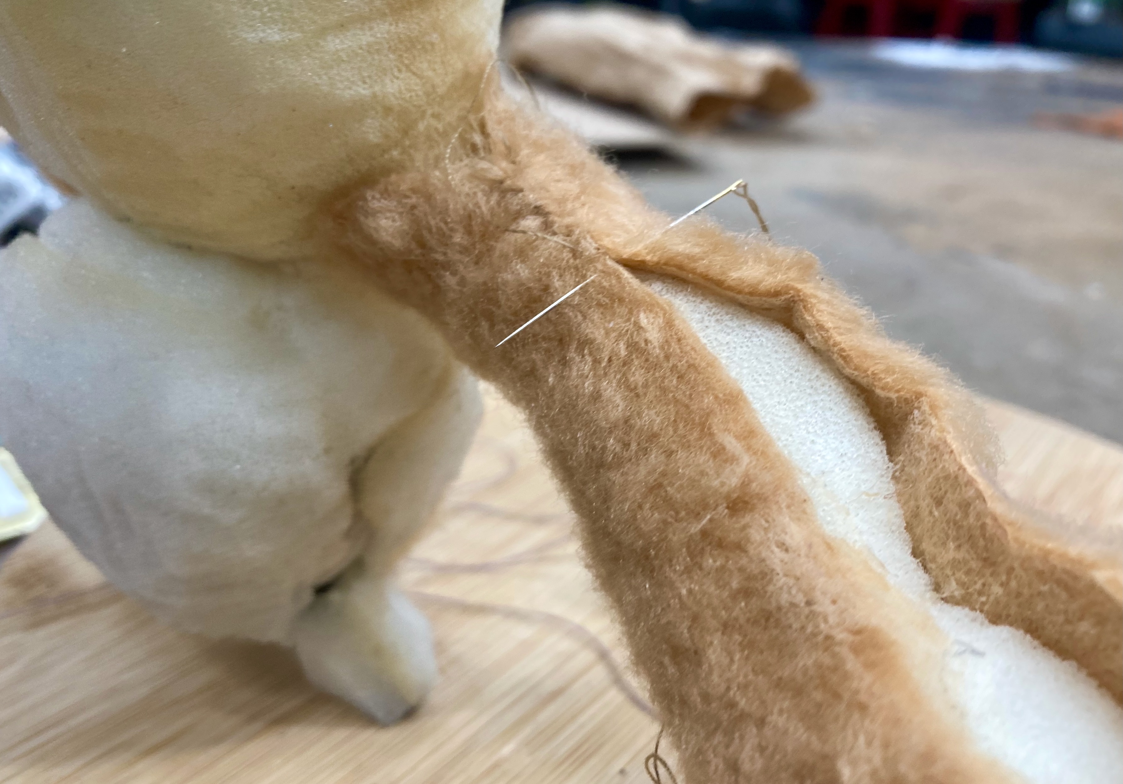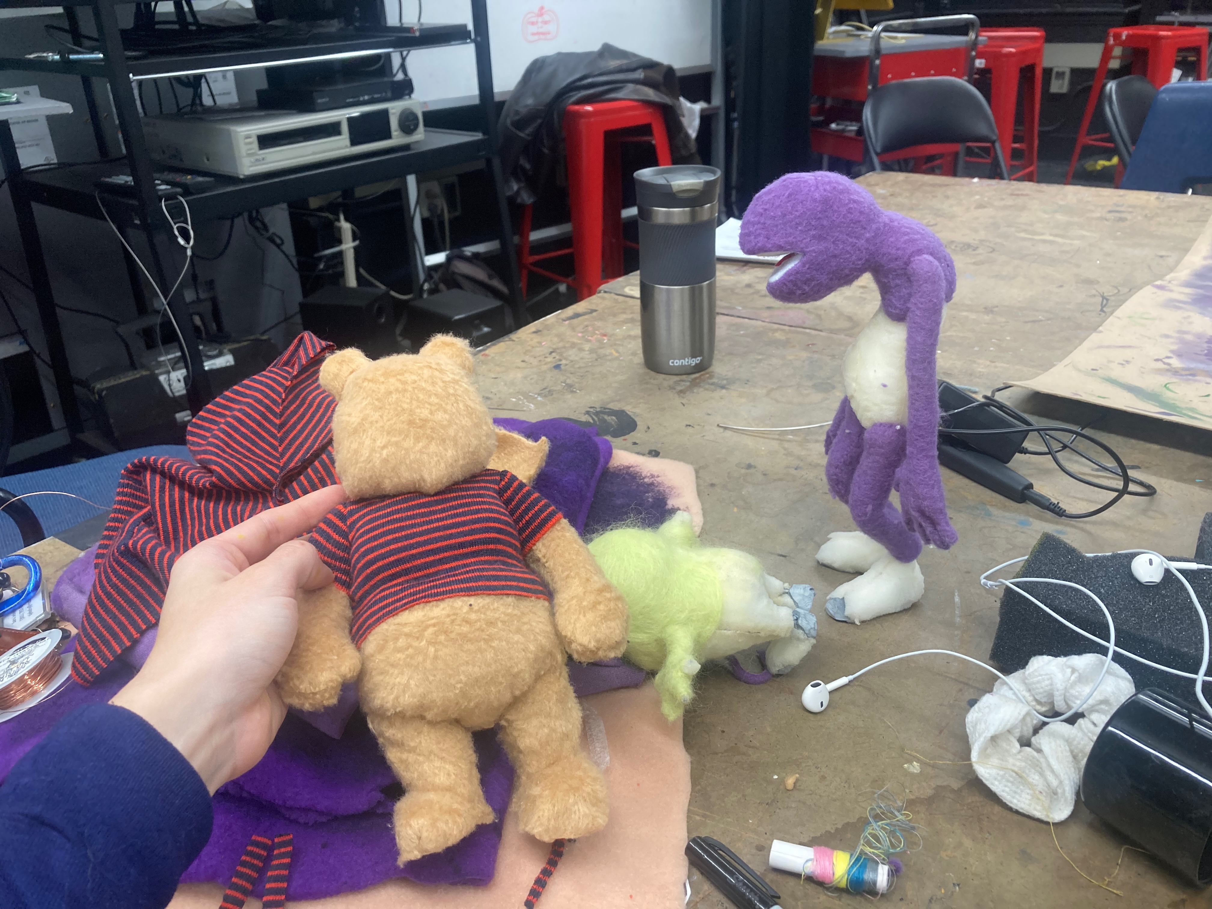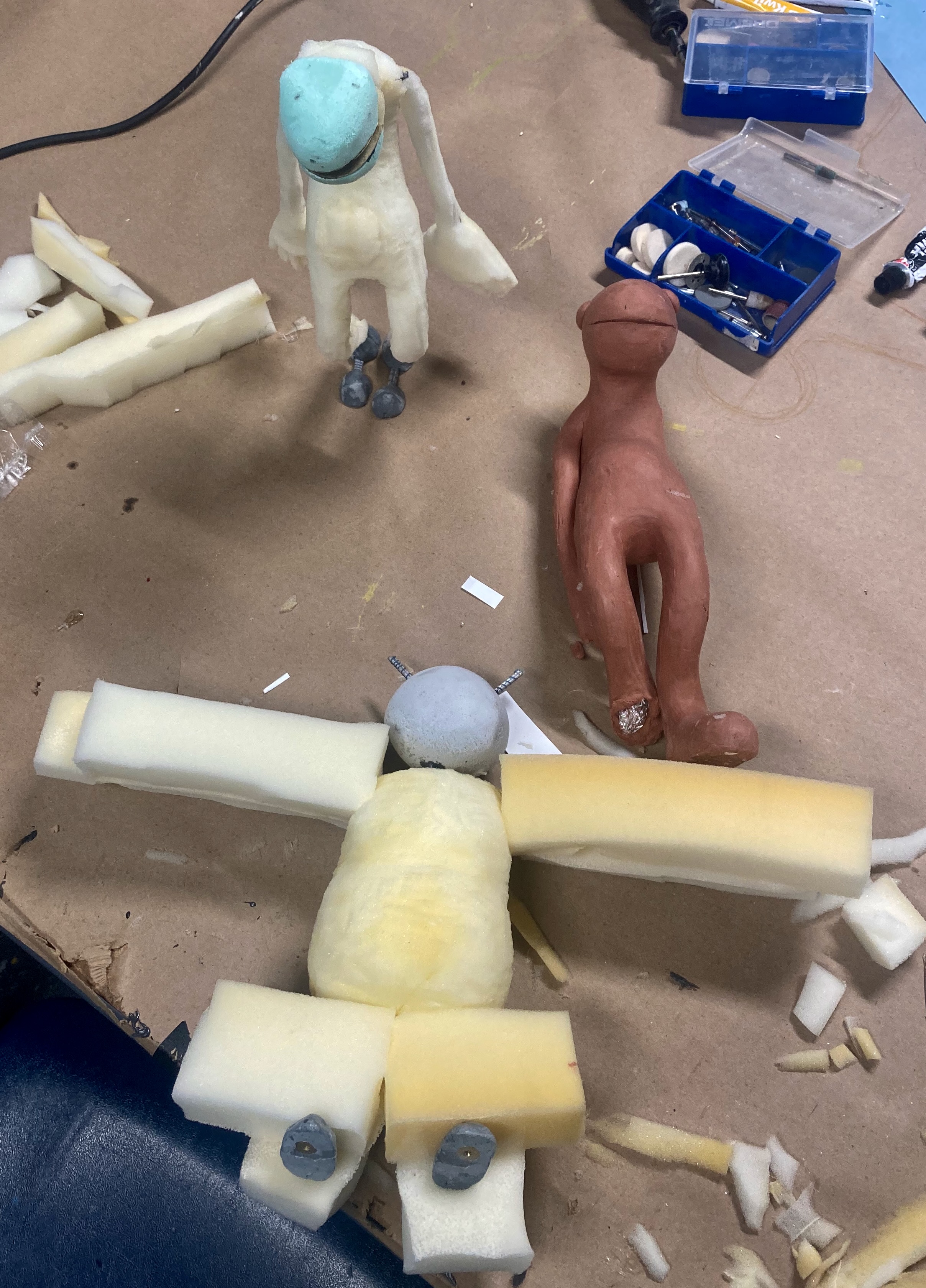 For the main characters the armatures were made with brass tubing, aluminum armature wire, copper wire, floral wire which was attached together with epoxy. Each puppet has tie down in the feet. Foam was applied with sprayable glue and cut to the desired shape of each puppet. Next their “skin/fur” was added by the methods of sewing fabric over the foam or dry needle felting. Finally they got personally tailored outfits and their polymer clay eyes got glued on and replacement mouths were also made for them.