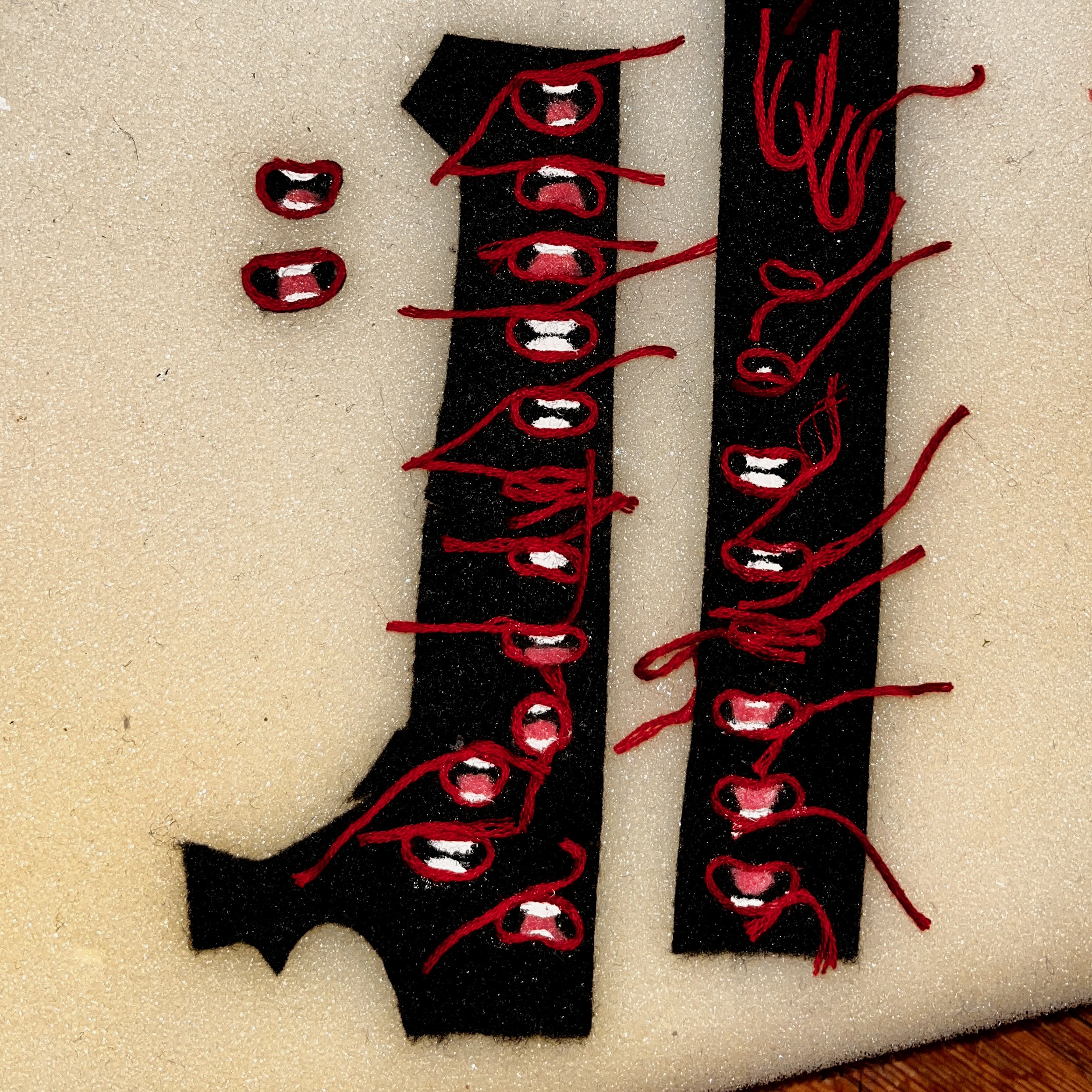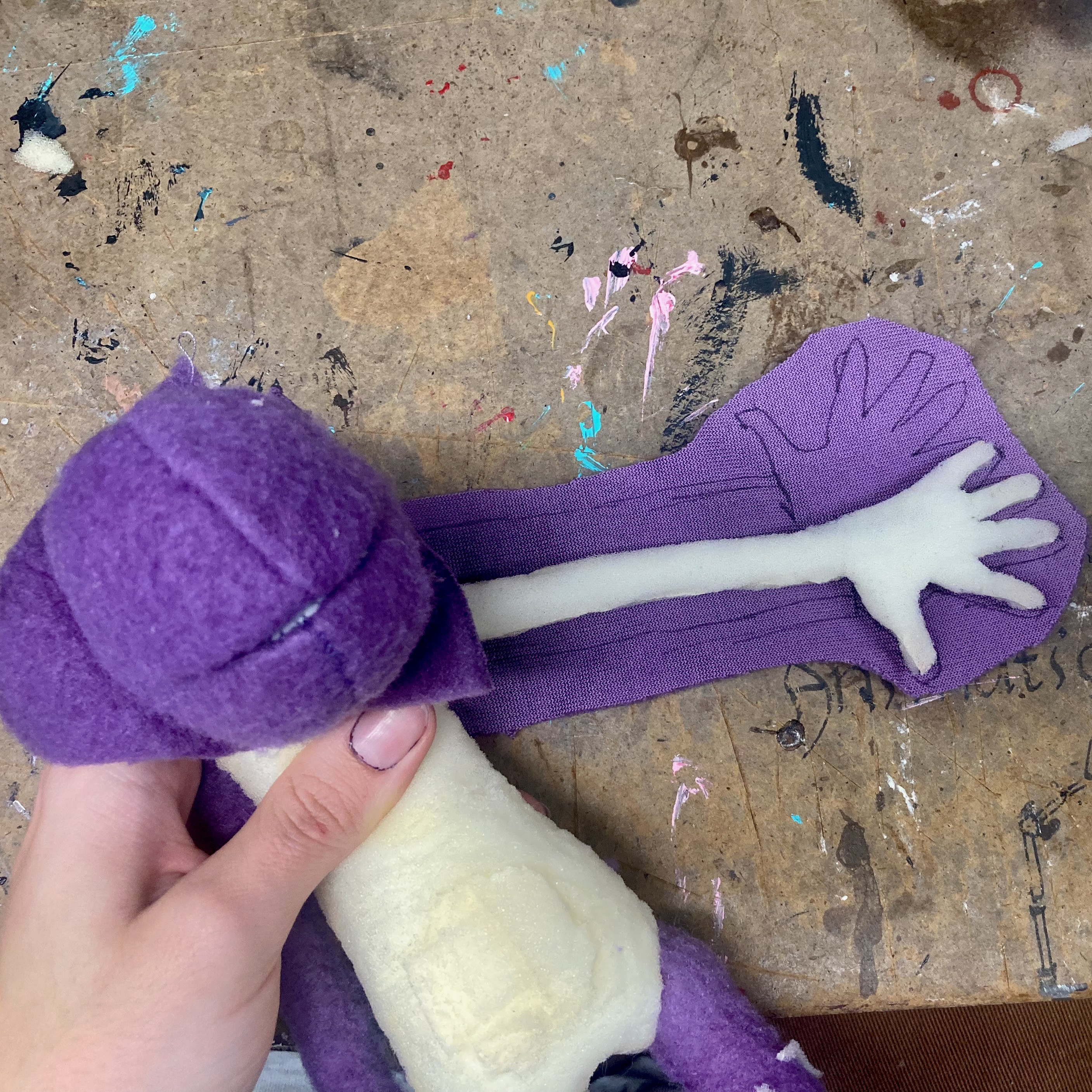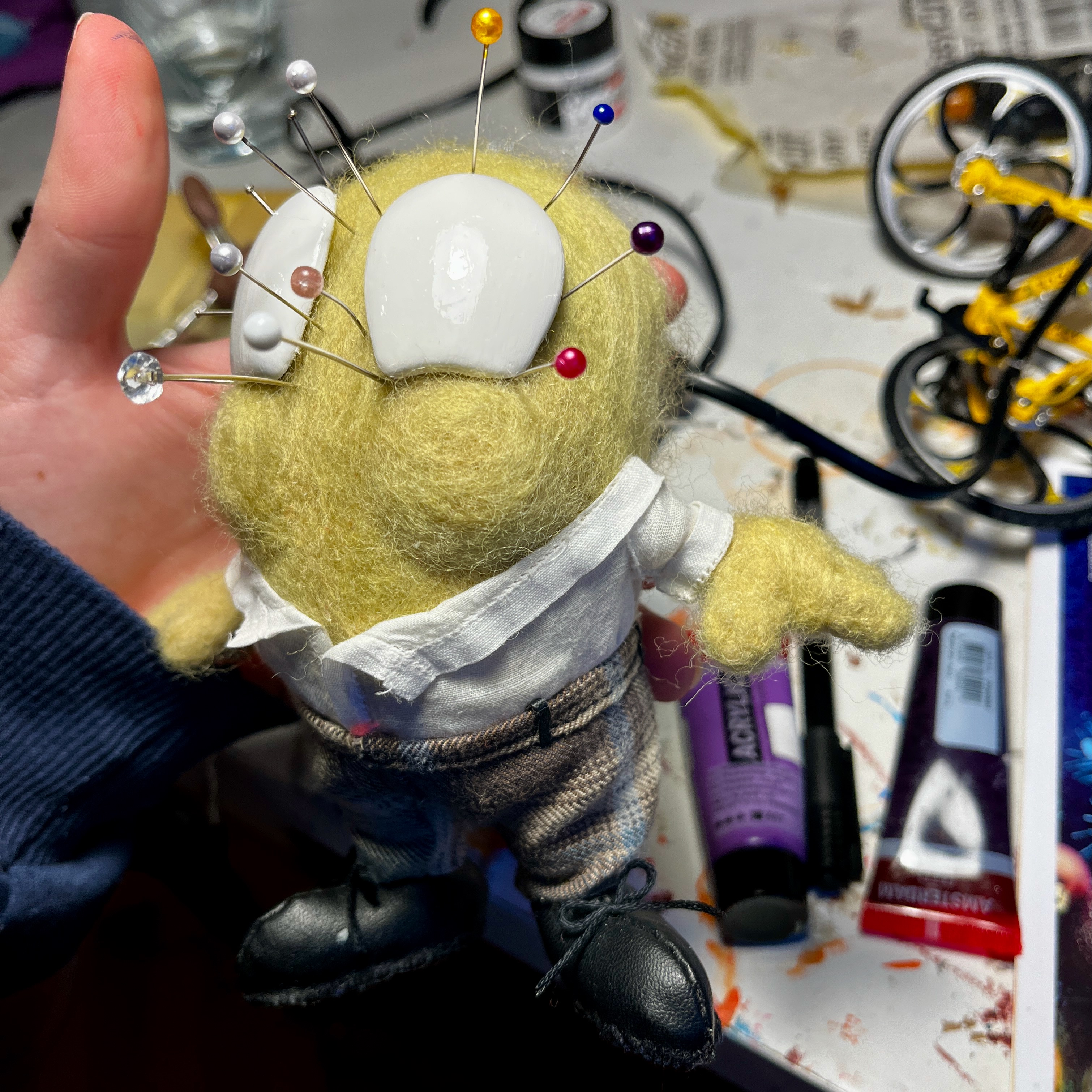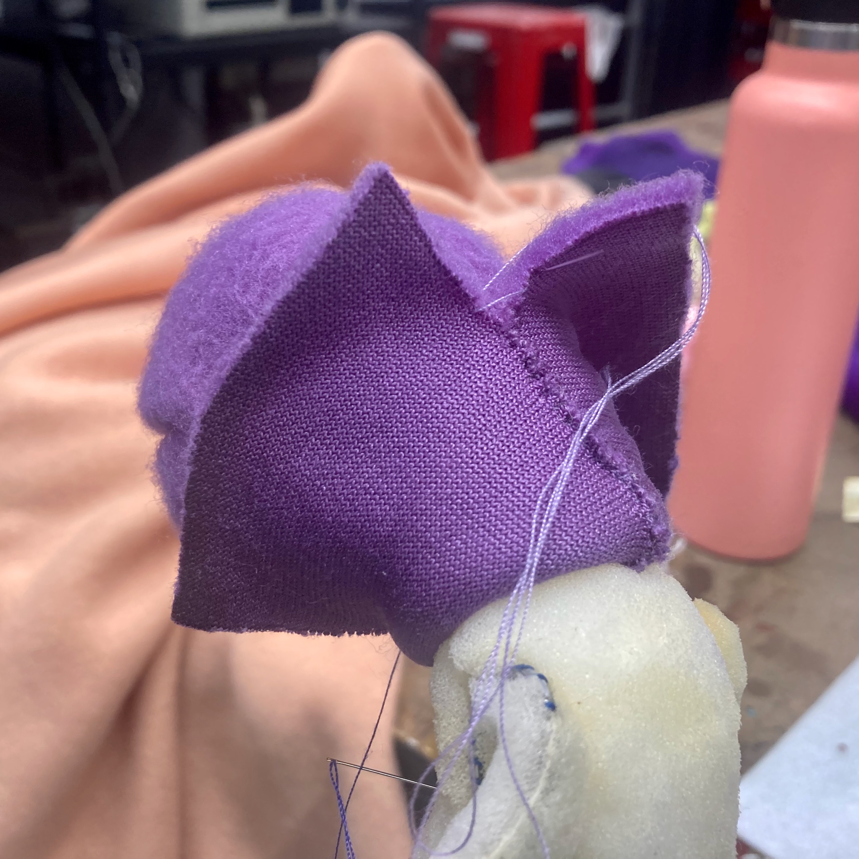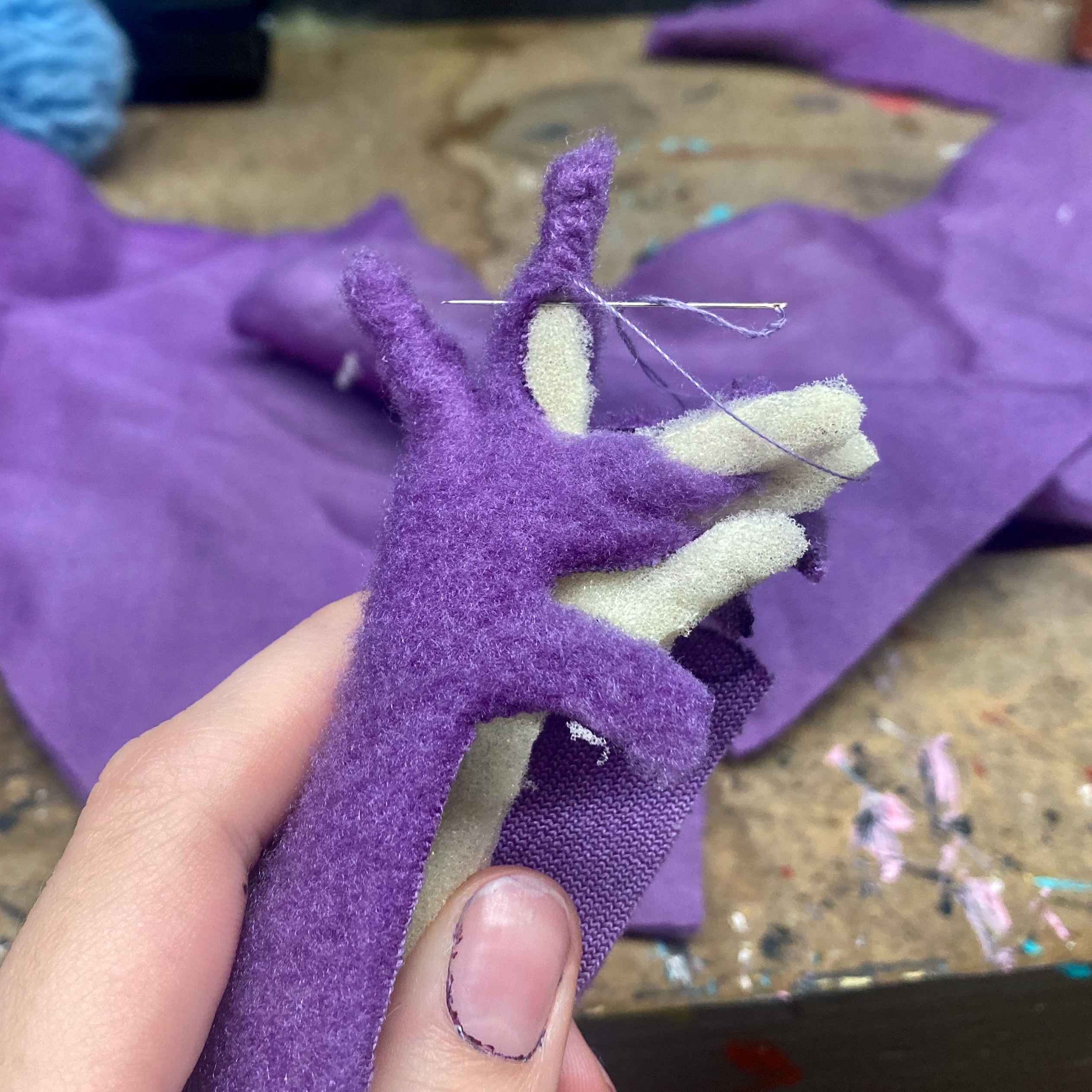 For the main characters the armatures were made with brass tubing, aluminum armature wire, copper wire, floral wire which was attached together with epoxy. Each puppet has tie down in the feet. Foam was applied with sprayable glue and cut to the desired shape of each puppet. Next their “skin/fur” was added by the methods of sewing fabric over the foam or dry needle felting. Finally they got personally tailored outfits and their polymer clay eyes got glued on and replacement mouths were also made for them.