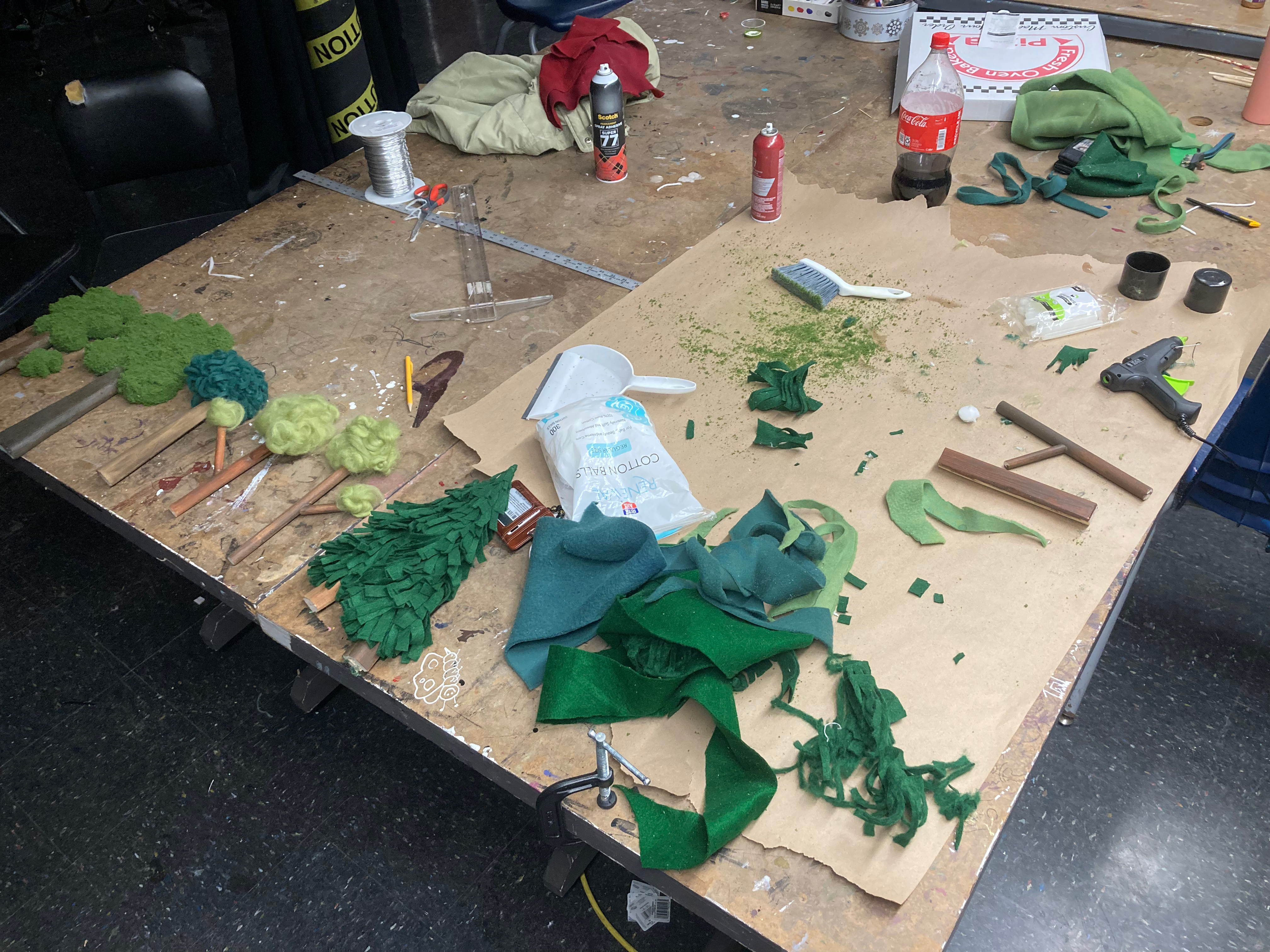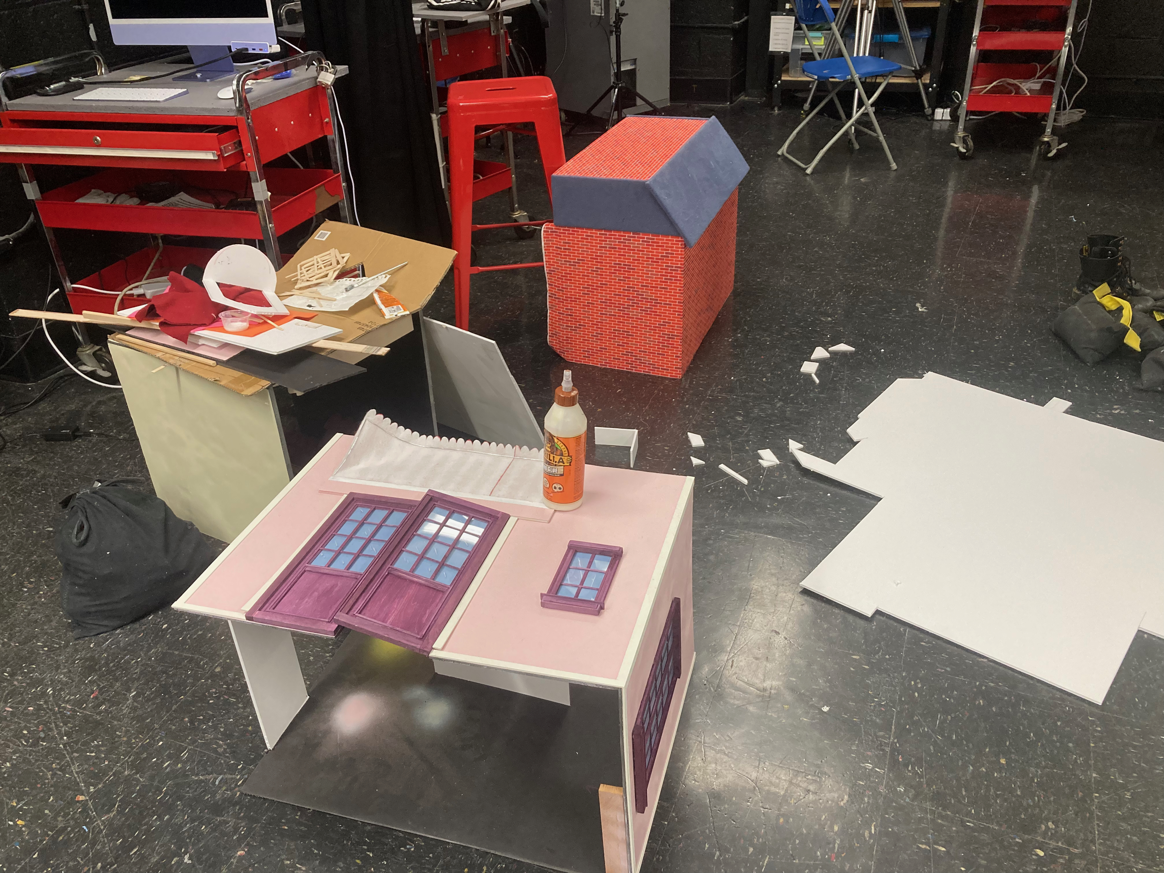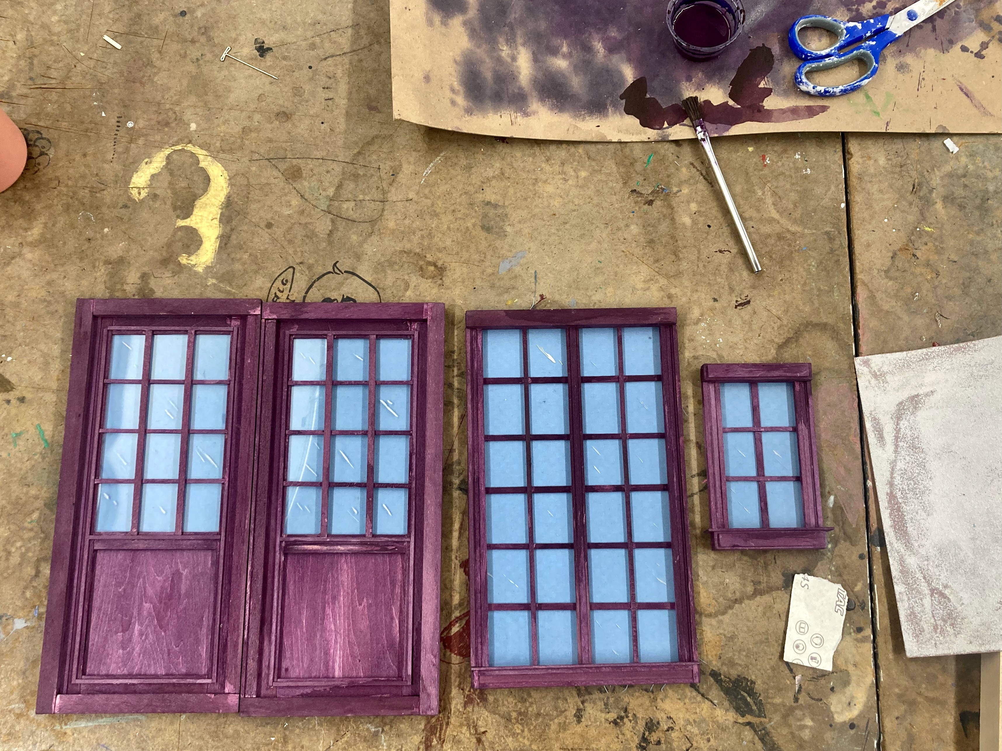 I used foamcore for the houses, either spraypainting them or spray gluing fabric to them. For the windows and doors I used wooden dowels and plastic to make the glass reflective. The trees are made of wood pieces and various fabrics. Other background elements like roads were made out of painted plywood, and the mountains were made of foam with fabric glued to them.