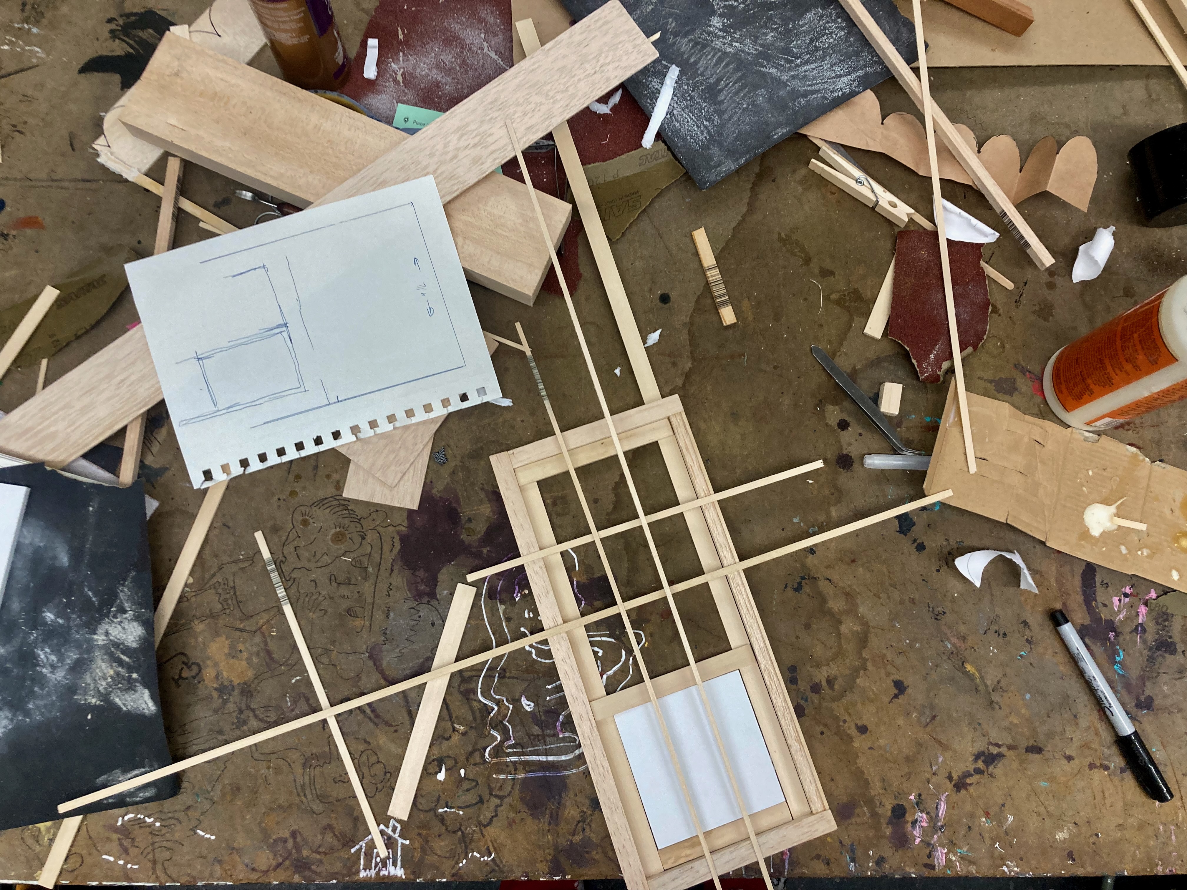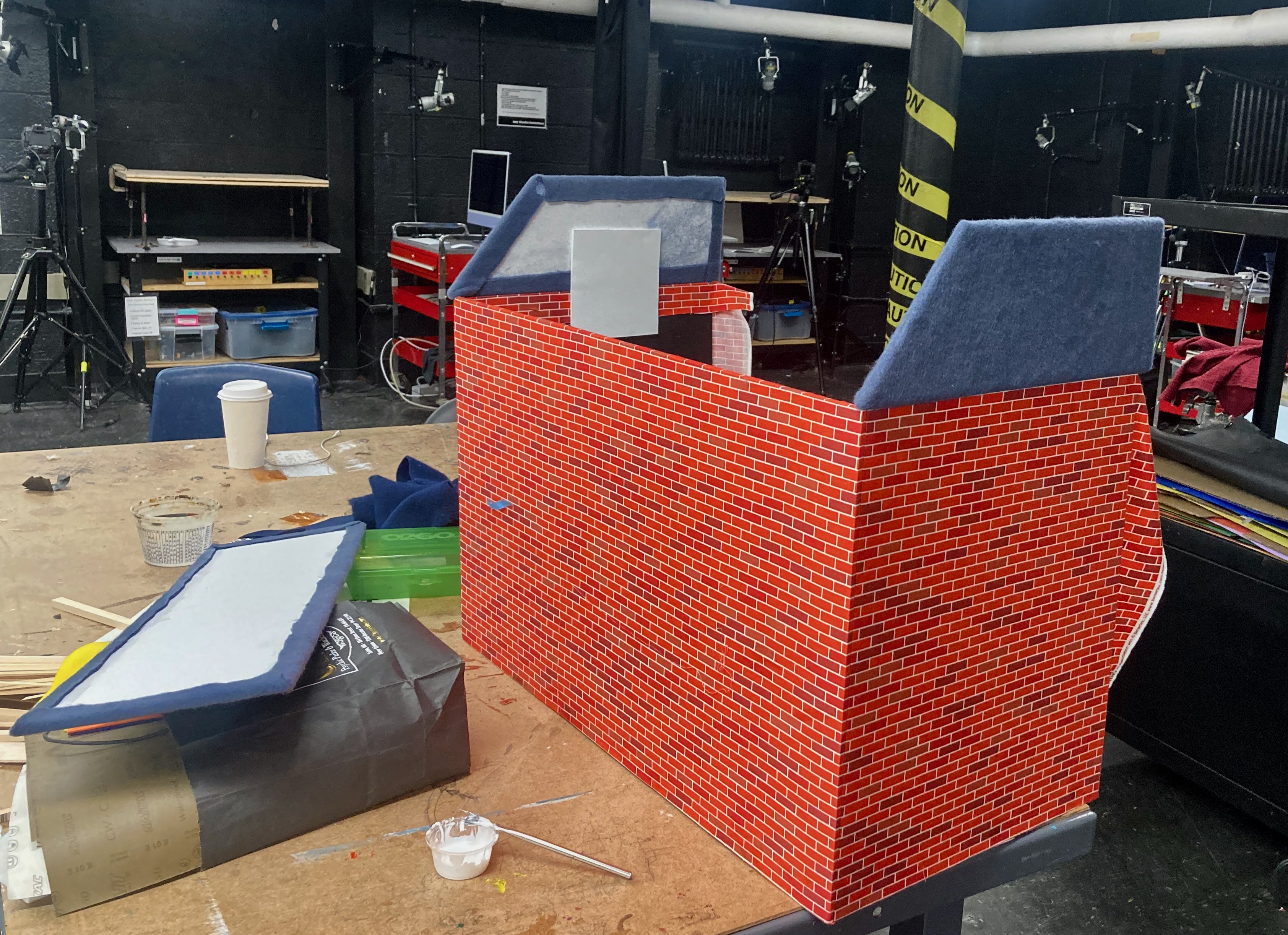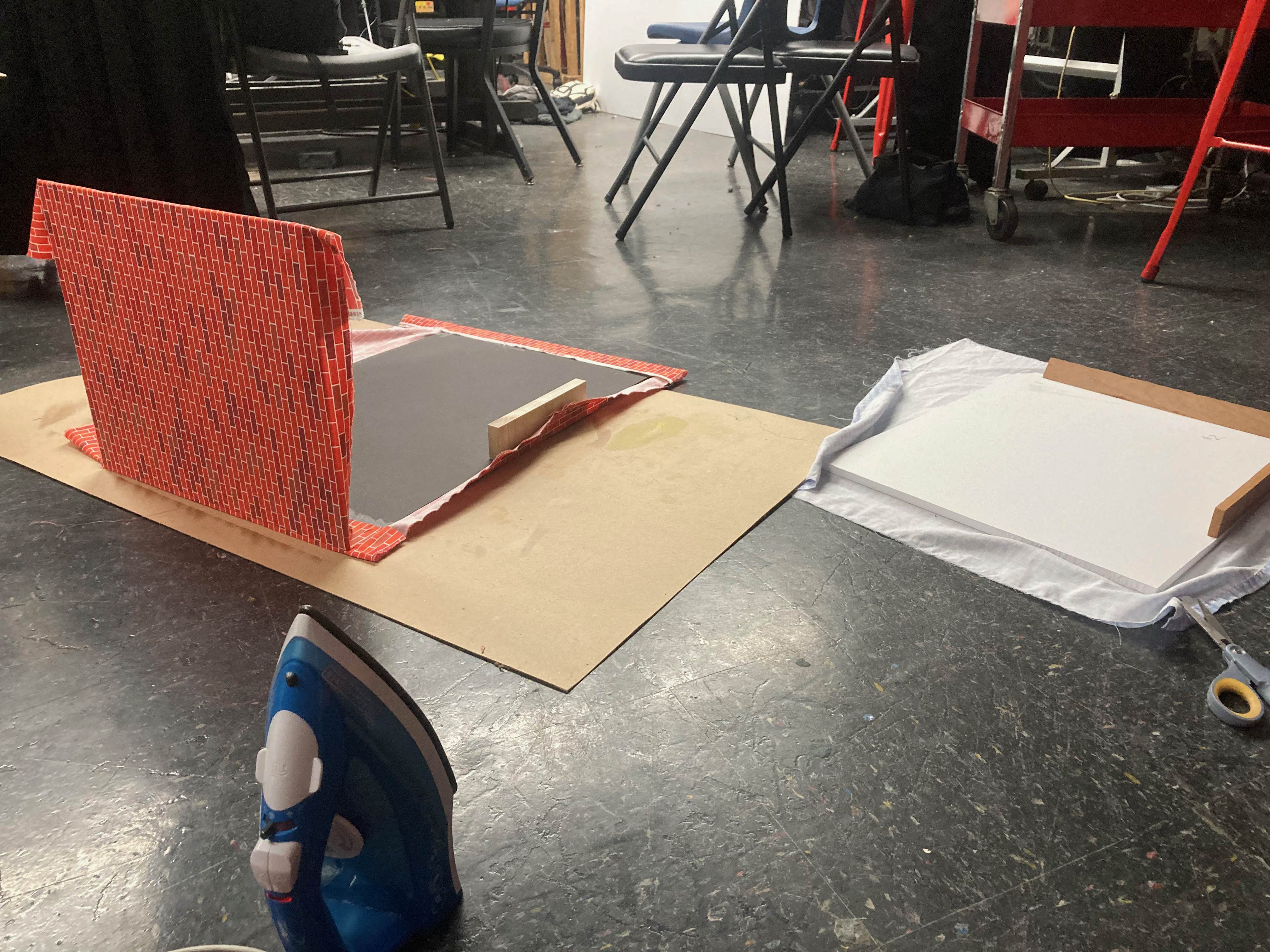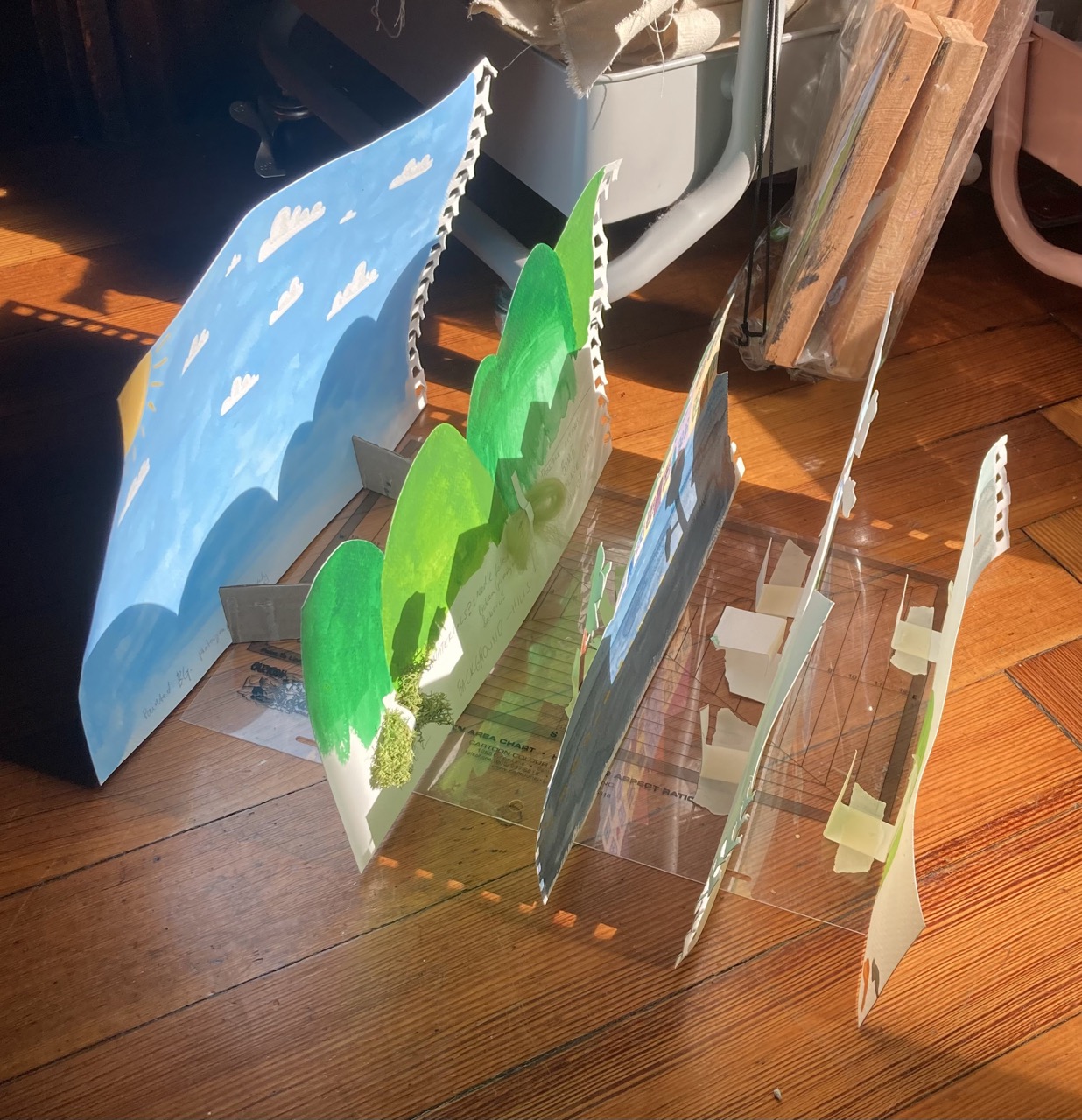 I used foamcore for the houses, either spraypainting them or spray gluing fabric to them. For the windows and doors I used wooden dowels and plastic to make the glass reflective. The trees are made of wood pieces and various fabrics. Other background elements like roads were made out of painted plywood, and the mountains were made of foam with fabric glued to them.